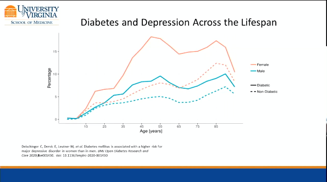 En el gráfico de arriba se muestra muy bien la relación entre la diabetes y la DEPRESIÓN a lo largo de los años, donde las líneas «sólidas o continuas» son las personas con diabetes (naranja mujeres y azul hombres) y las líneas «punteadas» son personas sin diabetes.